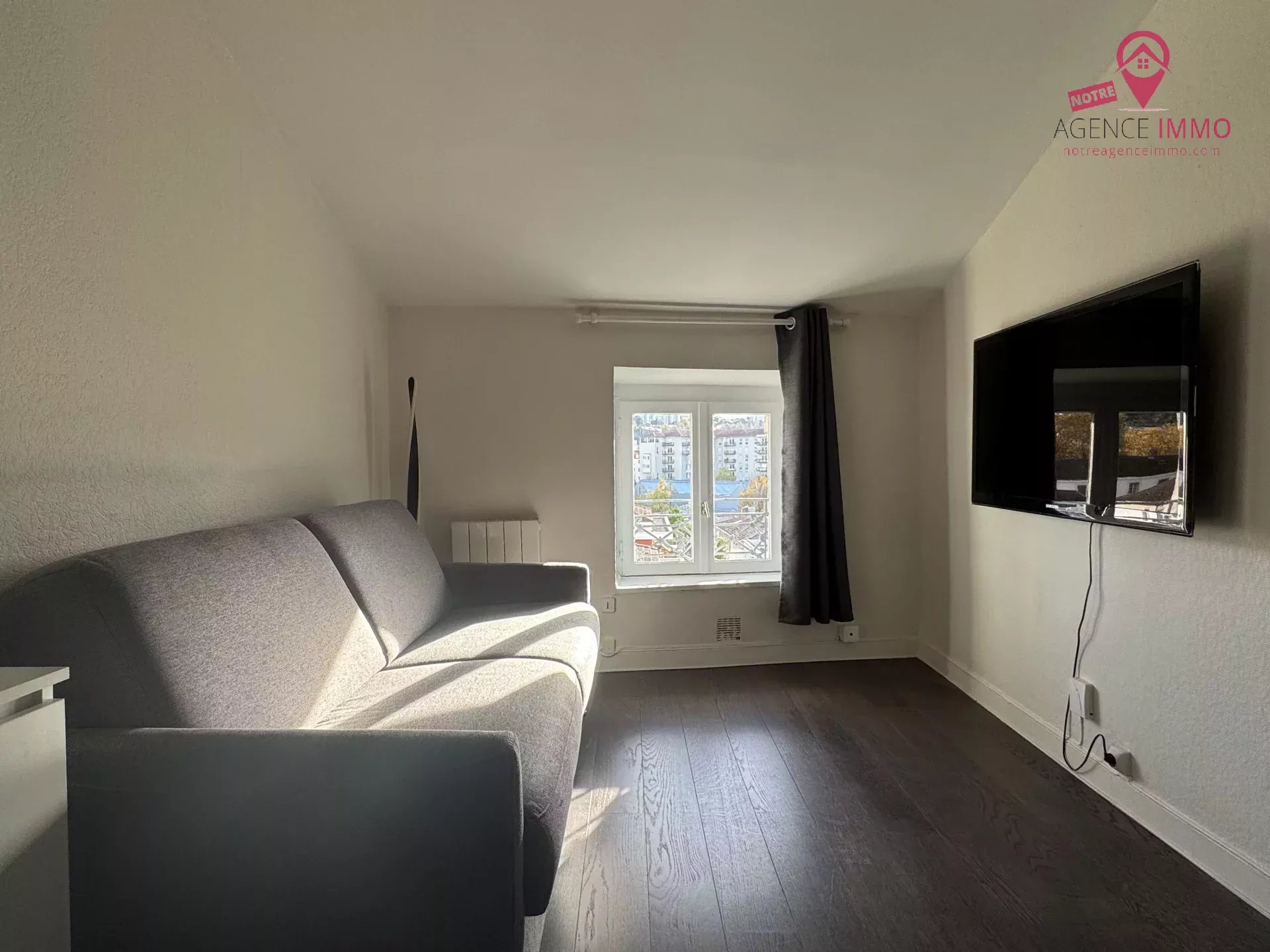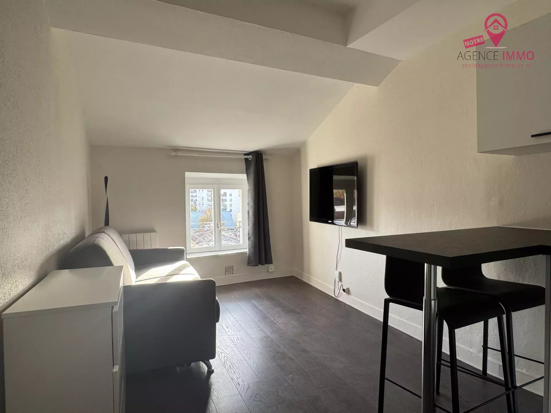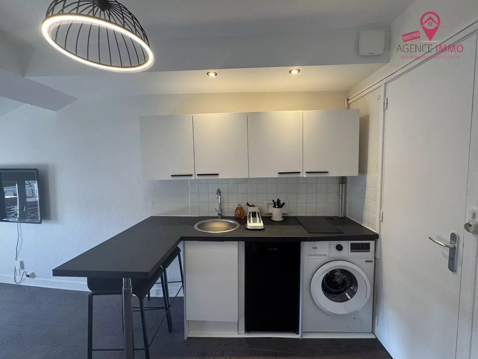 Ce studio meublé situé au 4ème étage sans ascenseur comprend une pièce de vie avec une cuisine aménagée et équipée (machine à laver, four à micro-ondes, réfrigérateur, plaque de cuissons), un canapé convertible en lit double avec une télévision, un accès à la fibre, une salle d'eau avec WC et un placard mural.